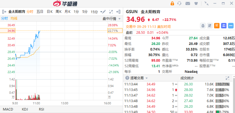 华盛资讯9月29日消息,金太阳教育逆势走强,截至发稿,现涨近23%,报34.96美元。优信二手车涨超4%,水滴涨超2%。
