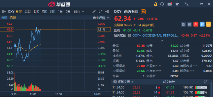 格隆汇9月29日丨西方石油 $OXY 逆市涨1.51%,报62.34美元,总市值579.9亿美元。