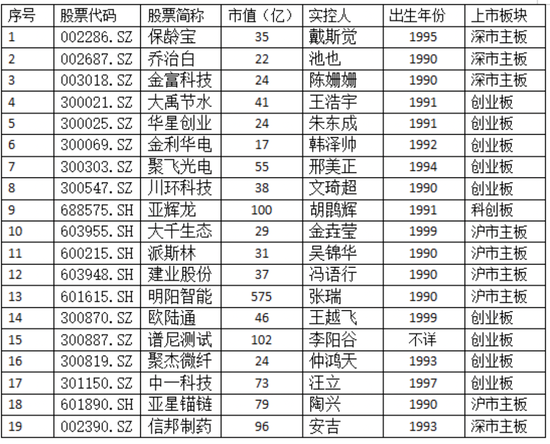 从上市板块来看,9家创业板公司,9家主板公司,1家科创板公司;从市值来看,多为小市值公司,16家市值低于百亿,只有3家超百亿,但这其中两家公司的90后实控人尚未担任董事长。截至9月27日,这19家上市公司总市值达1448亿元。