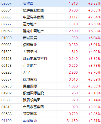 华盛资讯9月30日消息,港股地产股今日走强,截至发稿,碧桂园、旭辉控股集团涨超8%、富力地产、新城发展涨超6%,信和置业涨超4%。