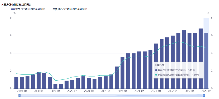 7月份,PCE同比上涨6.3%,核心PCE物价指数同比上涨4.6%,较6月份有所下降,核心PCE环比增长低于经济学家平均预期,一度让市场预期通胀将要见顶。不过,就目前经济学家对8月份数据的预期来看,通胀见顶之说为时尚早。