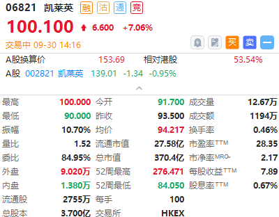凯莱英(06821)午后涨幅扩大逾7%,截至发稿,该股涨7.06%,报100.1港元,成交额1194万港元。