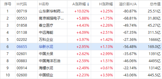 截至发稿,新华制药A股涨停,H股现涨3.25%;熊猫电子A股涨5.88%,H股现涨1.75%;中远海能A股涨4.43%,H股现涨2.26%。