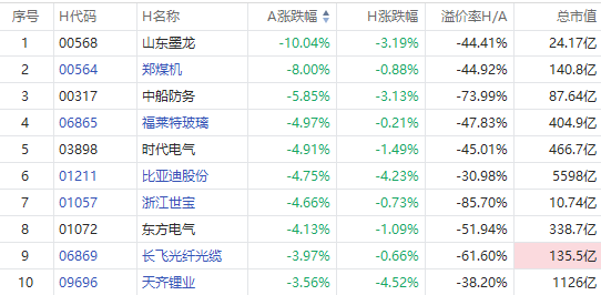 山东墨龙A股跌停,H股现跌3.19%;郑煤机A股跌8.00%,H股现跌0.88%;中船防务A股跌5.85%,H股现跌3.13%。