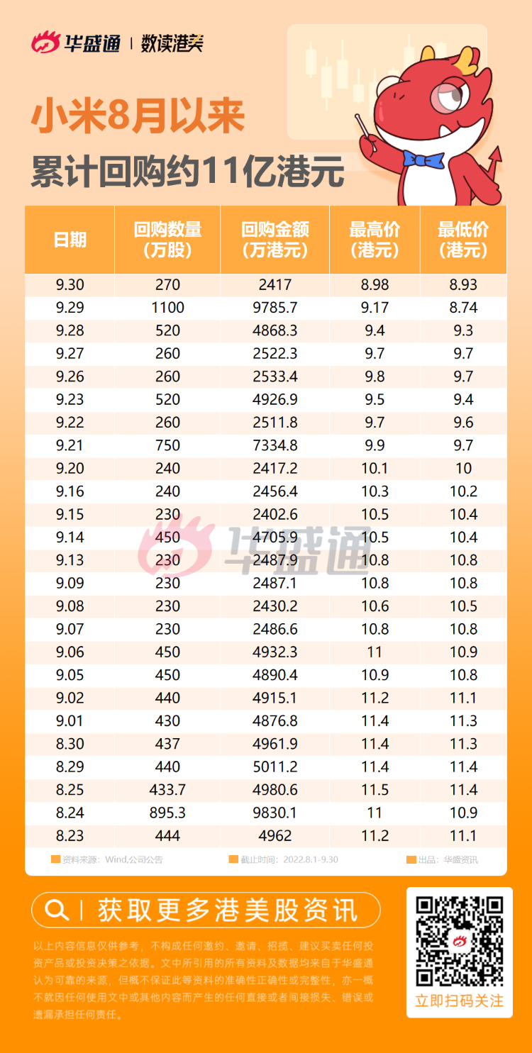 值得注意的是,8月以来,小米 $01810.HK 在25个交易日进行回购,累计回购10440万股,耗资约10.813亿港元。本年至今,小米共计购回19164.8万股。