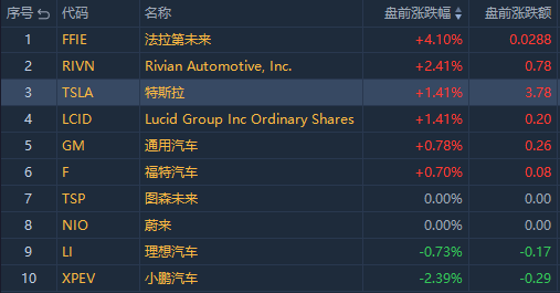 新能源车板块走势分化,法拉第未来涨超4%,Rivian涨超2%;特斯拉涨1.41%,隔夜重挫6.81%;Lucid、福特汽车等跟涨。理想汽车、小鹏汽车走弱。