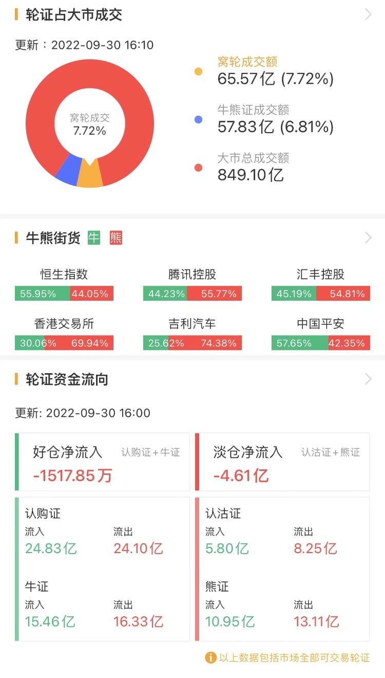 其中,窝轮总成交额为65.57亿港元,牛熊证总成交额为57.83亿港元。