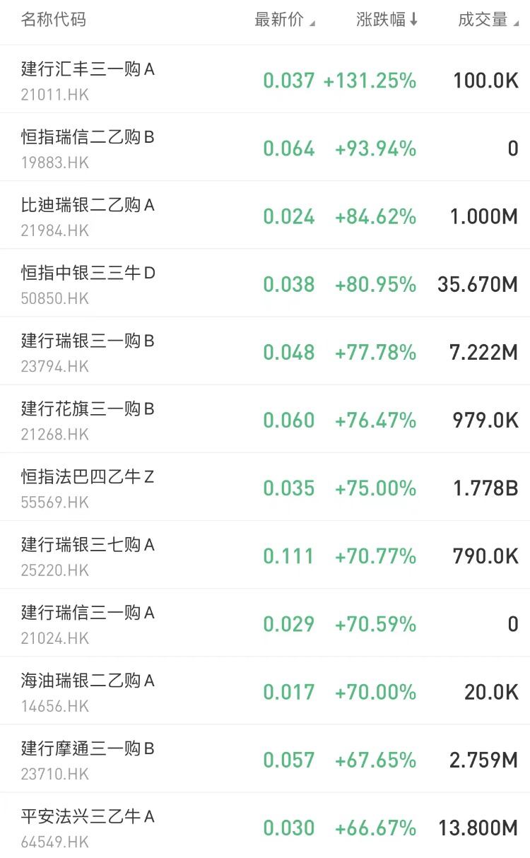 在今日涨幅榜中,建行汇丰三一购A涨131.25%,恒指中银三三牛D涨80.95%,平安法兴三乙牛A涨66.67%。