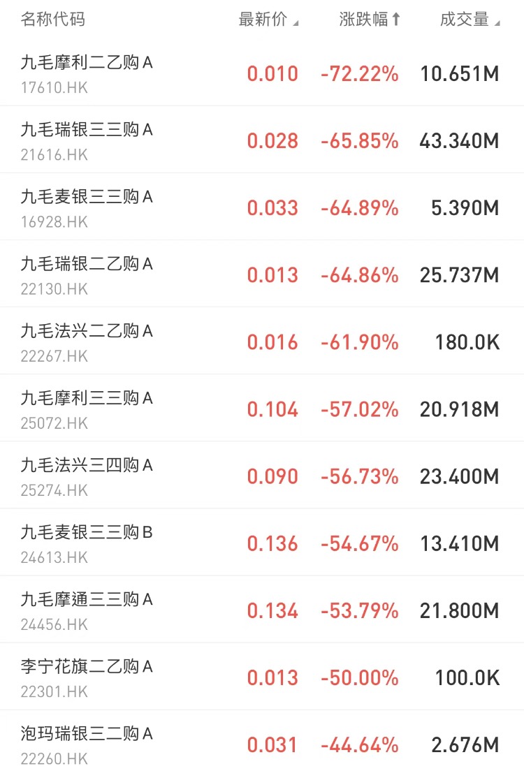 在今日跌幅榜中,九毛摩利二乙购A跌72.22%,李宁花旗二乙购A跌50%。