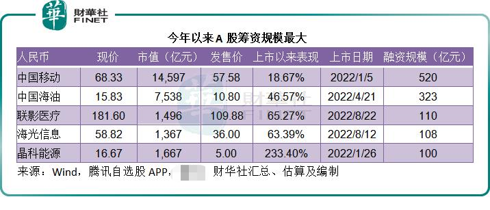 今年以来A股首发筹资规模最大的上市公司包括中国移动、中国海油、联影医疗(688271.SH)、海光信息(688041.SH)和晶科能源(688223.SH)。见下表,这些大型企业上市之后的股价表现都不俗,其中晶科能源更大涨233.40%。