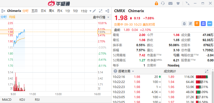 华盛资讯9月30日消息,美股盘中,猴痘概念股走强,截至发稿,Chimerix涨超7%,报1.98美元。INO、SIGA、GOVX涨超3%,VRAX涨超1%。