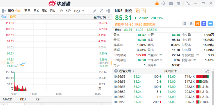 美股运动服装股普跌,截至发稿,耐克跌超10%,报85.31美元,成交额15.85亿美元,分析人士正消化该体育巨头努力清理过剩库存而造成的利润下降的消息。尽管耐克认为利润率压力将是暂时的,但当前财年的每股收益预期正在大幅下调。安德玛跌近6%,迪克体育用品跌超5%。