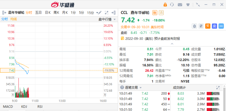 邮轮板块集体下挫,截至发稿,嘉年华邮轮跌19%,报7.42美元,股价触及1993年以来最低水平。尽管近期预订量激增,但公司预计第四季度仍将出现亏损。挪威邮轮跌超16%,皇家加勒比邮轮跌超12%。