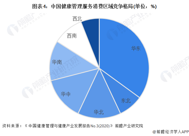 2020年8月25日,中关村新智源健康管理研究院、社会科学文献出版社及经济观察报共同发布的《中国健康管理与健康产业发展报告No.3(2020)》数据显示,我国健康管理消费情况主要集中在华东、华北、华中、华南等东部地区,分别占全国健康管理服务消费总量的35%、14%、14%、13%。