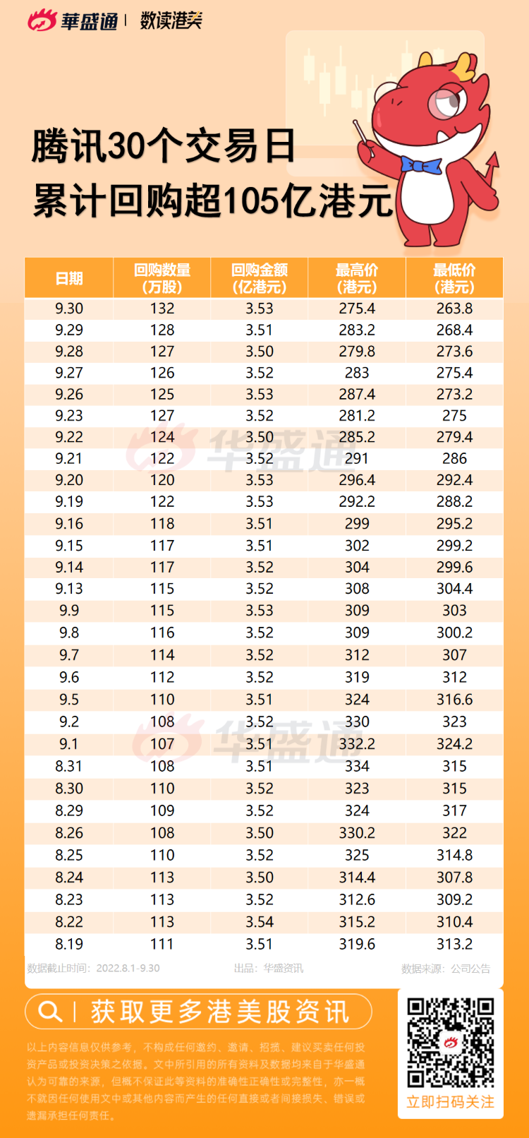 截止9月30日,腾讯已连续30个交易日进行回购,累计回购3497万股,耗资约105.53亿港元,位列港股回购榜第一名。其年内累计回购次数已达67次,回购金额约205.64亿港元,同时创下今年港股回购金额之最和腾讯历史上回购金额之最。