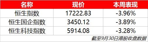 恒生指数本周跌3.96%,报17222.83点创下近11年来新低;恒生科技指数本周跌3.89%,报3450.12点;国企指数本周跌3.28%,报5914.08点。