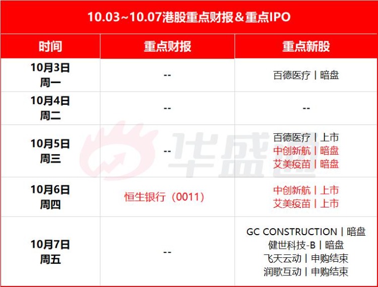 下周有恒生银行将发布财报,同时将迎来多只重磅新股:百德医疗将于下周三挂牌上市、中创新航、艾美疫苗将于下周四挂牌上市。