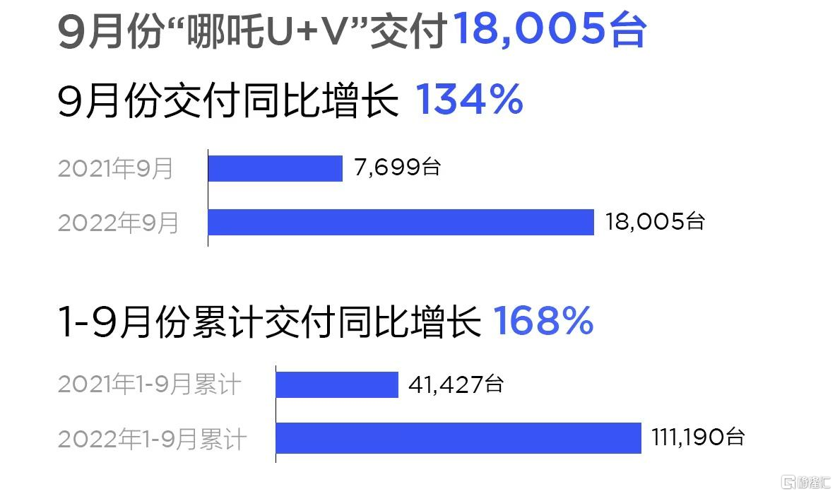 9月,哪吒汽车交付18005台,再创历史新高,同比劲增134%,实现连续27个月同比增长。2022年1-9月,哪吒汽车交付111190台,同比增长168%。