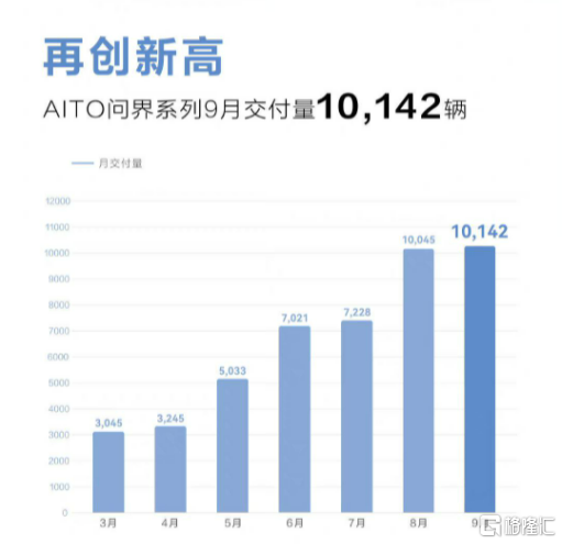 华为AITO品牌公布了9月交付数据,问界系列9月交付量达到10142辆,延续8月份增长势头,交付量再创新高,实现连续2个月单月交付量破万。