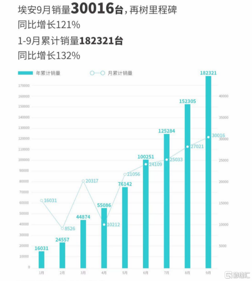 埃安9月销量30016台,同比增长121%,今年1-9月累计销量182321台,同比增长132%。
