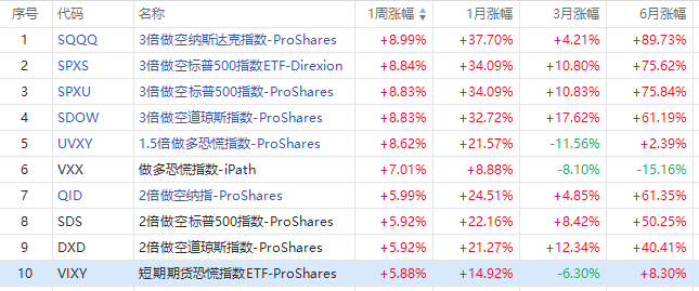 美股股指ETF方面,本周3倍做空纳指 $SQQQ 、标普500 $SPXS $SPXU 和道指 $SDOW 的ETF涨幅居前,周内累计涨幅均在8.8%至9%之间。