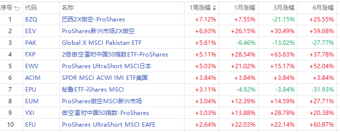 区域ETF方面,本周2倍做空巴西的 $BZQ 和做空新兴市场的 $EEV 涨幅居前,其余上榜也多为做空类ETF。