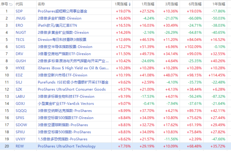 从ETF周涨幅榜看,主要为反向/做空类ETF领涨,小市值基金做空公用事业的ETF $SDP 周涨19.07%位居第一。本周美元指数有所降温,黄金指数反弹,做多黄金类ETF上榜,2倍做多金矿的 $JNUG 周涨16.6%位列第二。此外,做空半导体、房地产及做多能源ETF涨幅紧随其后。