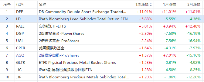 本周商品ETF中,做多实体钯 $PALL 和做多黄金的ETF $DGP $UGL 涨幅居前。美元指数下半周回调,按照最活跃合约计算,黄金期货指数周线小幅反弹,但从月线看黄金期货已经连跌6个月创下今年新低。