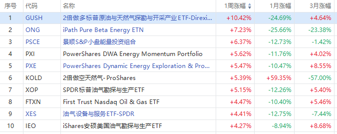本周能源股继续弱势,WTI原油期货、布伦特原油期货及天然气期货周线接近平收。不过石油天然气服务企业表现相对强势,2倍做多原油天然气探勘开采的 $GUSH 周涨10.42%。