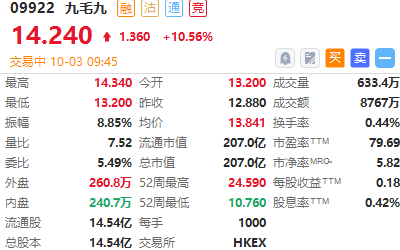 九毛九斥资11亿收购广州商厦项目26%股权,市场恐慌性抛售,公司股价上周五暴跌20%,市值蒸发近50亿港元,此后九毛九澄清,公司此次收购广州国际金融城项目并非进军房地产,今日早盘,九毛九反弹10%,市值207亿港元。