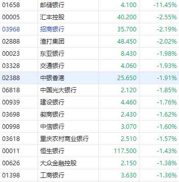 华盛资讯10月3日消息,港股银行股走低,邮储银行跌超11%,股价日内一度创52周新低,此前遭李嘉诚基金减持5万股。汇丰控股、招商银行、渣打集团跌超2%,建设银行、工商银行、中信银行、中银香港均跌逾1%。
