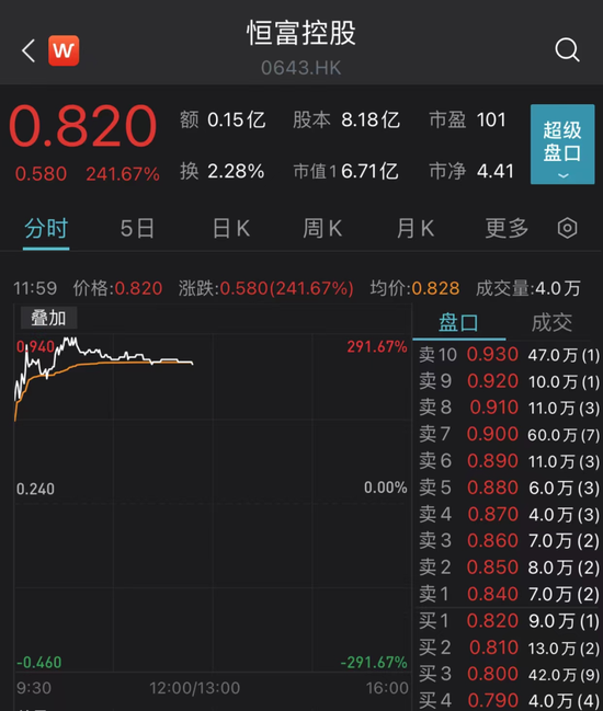 消息面上,恒富控股宣布,控股股东李海枫向要约人马小秋出售4.11亿股股份,相当于公司已发行股本50.28%,现金代价9829.82万港元,即每股出售股份0.239港元,较公司停牌前报价0.24港元折让0.42%。