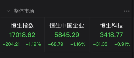 10月3日,港股盘中冲高回落。截至午间收盘,香港恒生指数、恒生中国企业指数、恒生科技指数分别下跌1.19%、1.16%、0.91%。