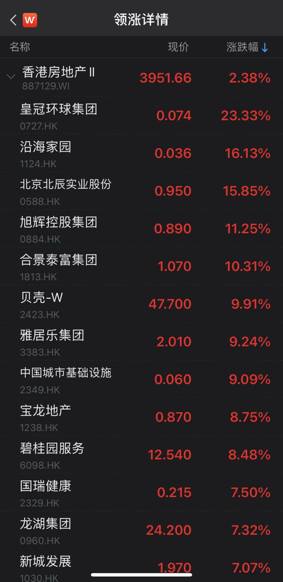 房地产板块中,天皇冠环球集团、沿海家园、北京北辰实业股份涨幅居前,分别上涨23.33%、16.13%、15.85%。碧桂园服务、龙湖集团、碧桂园、融创服务等均显著上涨,分别上涨8.48%、7.32%、6.04%、5.58%。