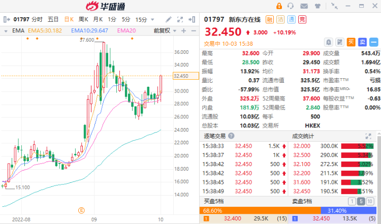 新东方在线午后涨10%,报32.45港元,成交1.694亿港元。此前,东方甄选于9月24日举办了一场宁夏新疆农产品主题的专场直播带货活动,收获超8000万元单日GMV,创历史新高。