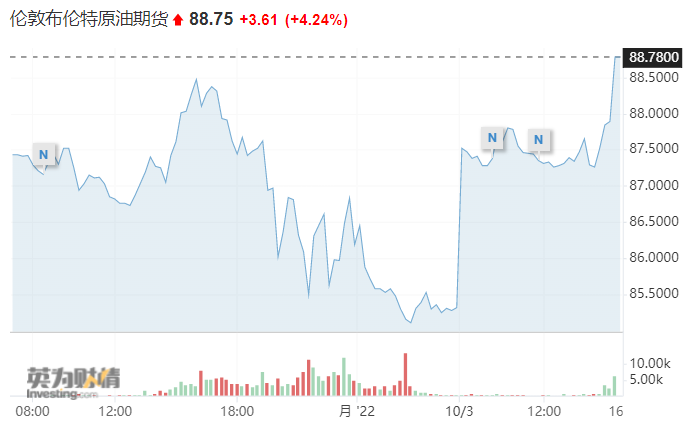 受减产消息影响,油价大幅上涨。截至发稿,WTI原油涨4.4%至每桶82.99美元;布伦特原油上涨4.24%至每桶88.75美元。