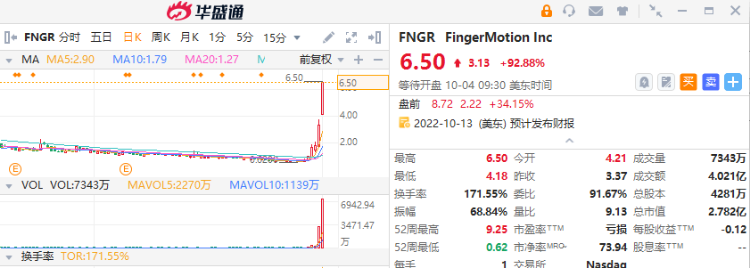 中概妖股FingerMotion Inc盘前涨近35%,该股近六个交易日涨近10倍。公开资料显示,FingerMotion致力于在中国市场提供移动支付和充值服务,该公司主要通过向中国联通和中国移动的客户提供这些服务来赚取收入。