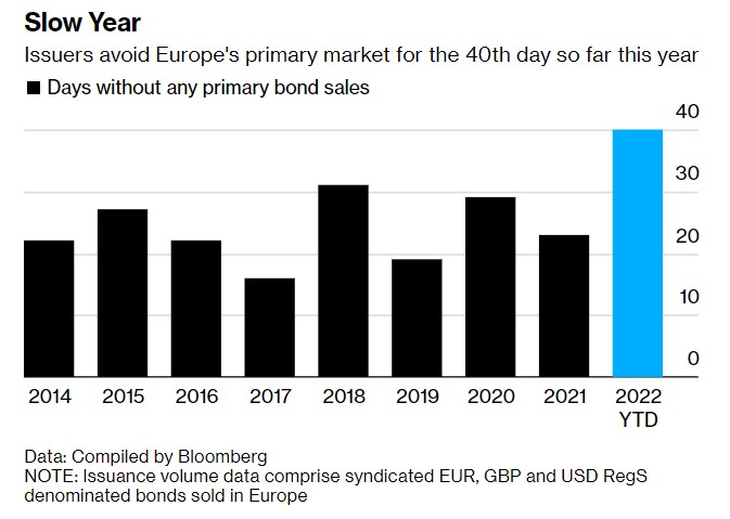 此外,由于要考虑的风险如此之多——从通胀数据到俄乌冲突,再到英国的政治发展——潜在的发行人和安排交易的银行也很难挑选一个进行交易的好时机,除此之外,交易双方往往也会试图避开计划中的经济数据发布、央行会议和公告等可能令市场情绪恶化的日子。