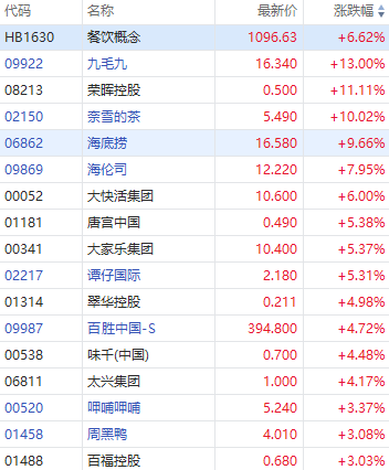 餐饮股午后持续走高,截至发稿,九毛九涨超13%,荣晖控股涨超11%,奈雪的茶涨超10%,海底捞涨超9%,海伦司涨超7%,大快活涨6%,谭仔国际涨超5%,大家乐、翠华控股、百胜中国涨超4%。