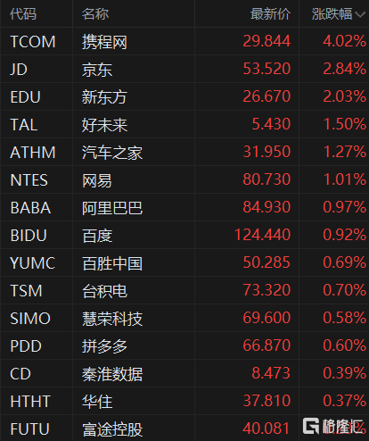 格隆汇10月5日丨中概股逆市走强,纳斯达克中国金龙指数涨0.19%,报6579.81点。携程网涨超4%,京东、新东方涨超2%,好未来、网易、汽车之家涨超1%,阿里巴巴、百度、台积电等跟涨;小鹏汽车跌超5%,爱奇艺、蔚来、理想汽车跟跌。