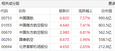 10月6日讯,今日港股航空股再度走高,截至发稿,中国国航 $00753.HK 涨3.79%、南方航空 $01055.HK 涨超7%,东方航空 $00670.HK 涨6.81%。