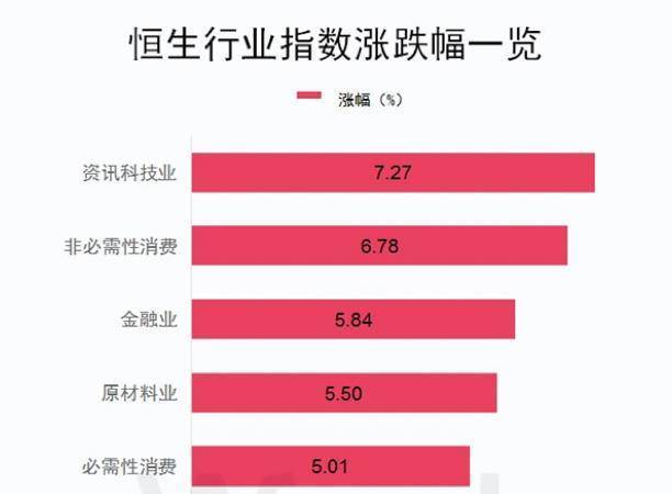从行业表现看,恒生行业指数日内全线上涨,资讯科技业涨7.27%,非必需性消费涨6.78%,金融业涨5.84%。