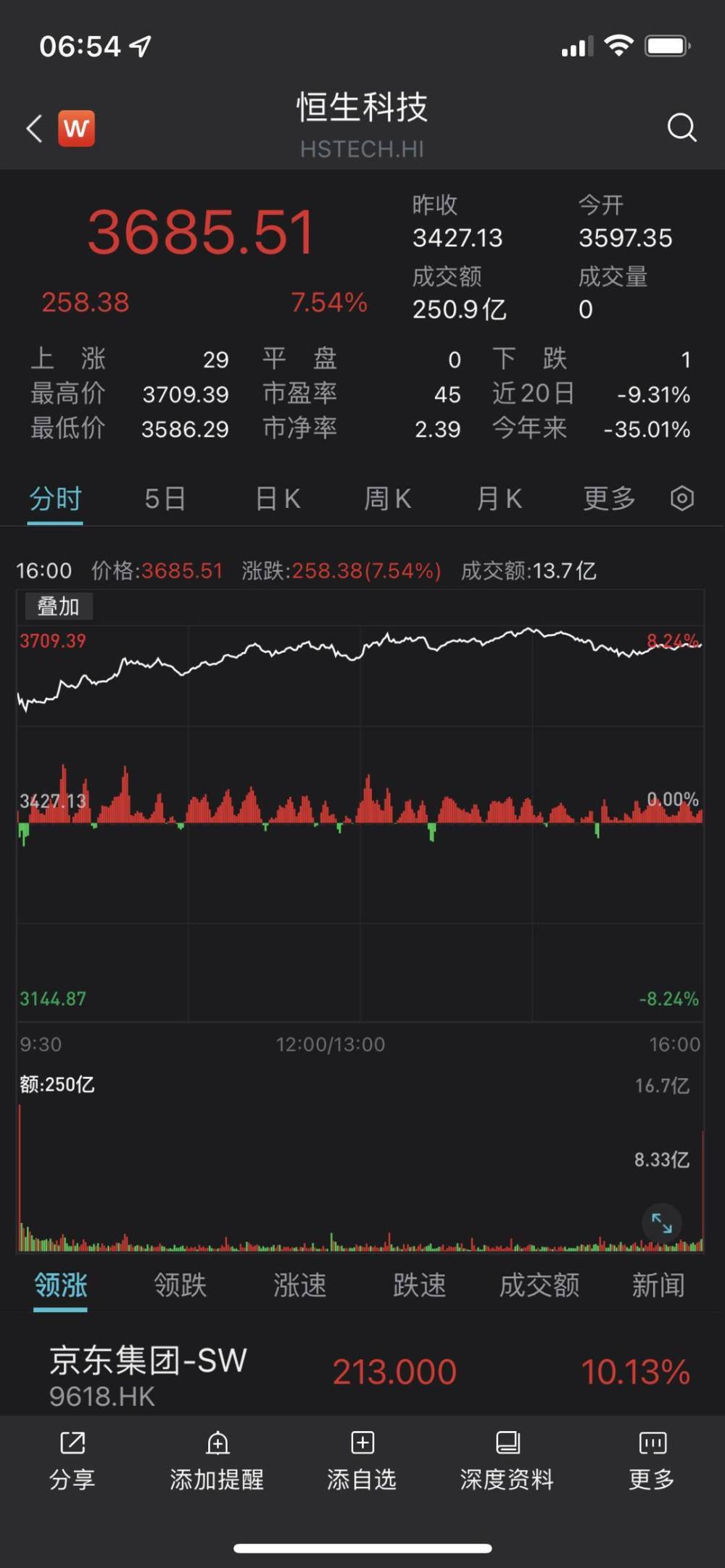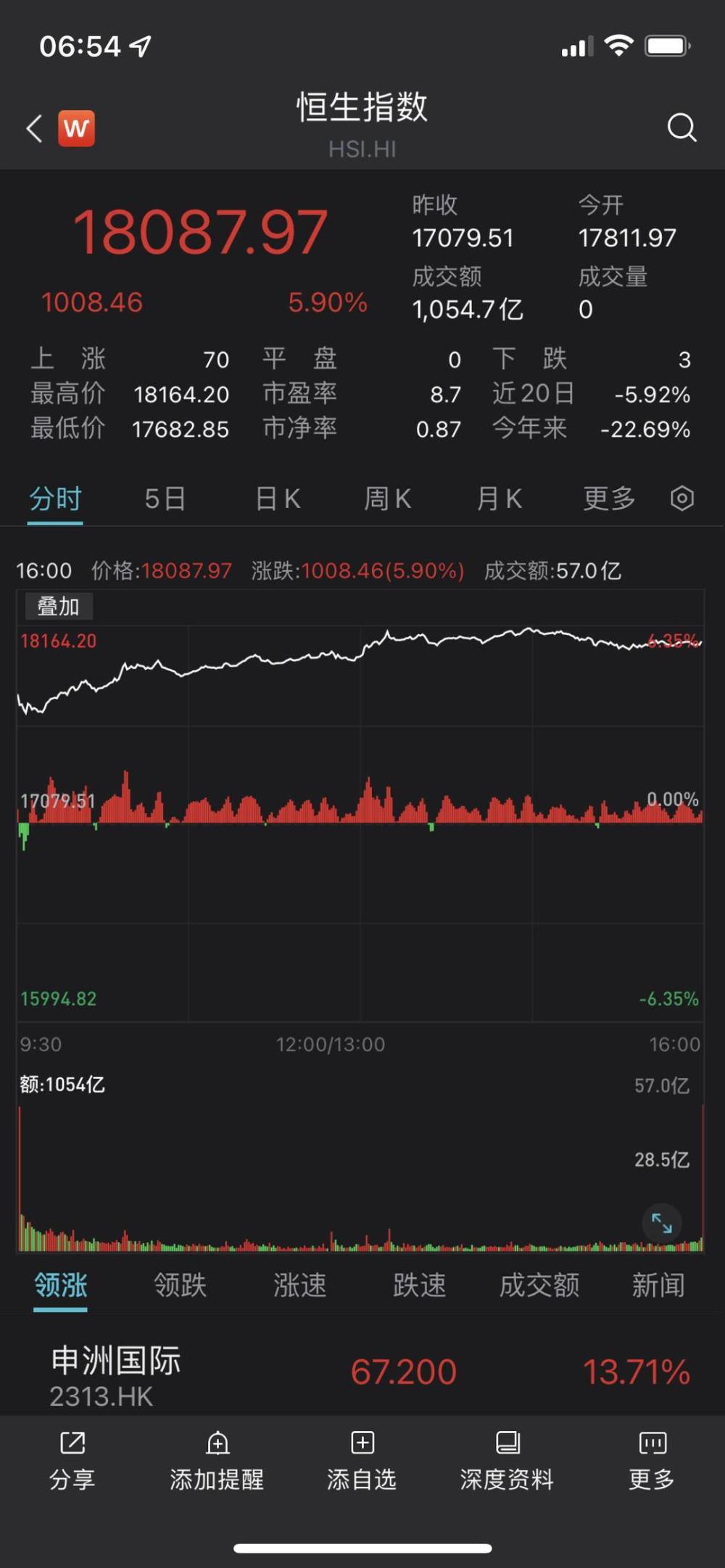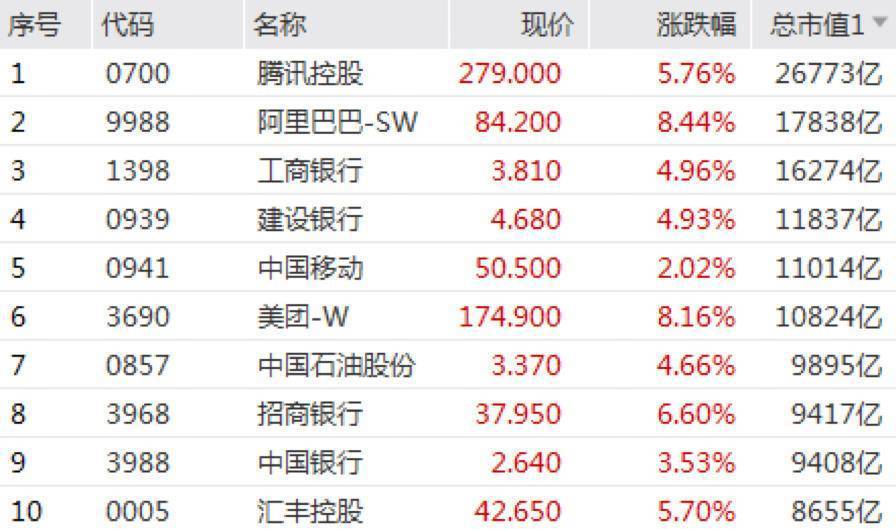 恒指成分股市值前20名公司全线大涨。龙头科技股集体大涨,京东集团涨逾10%,网易、美团、阿里巴巴涨逾8%。假期消费概念股涨幅居前,九毛九涨近15%,终止收购碧桂园旗下广州国际金融城项目公司26%股权事项;华住集团涨逾10%,奈雪的茶涨逾9%。个股方面,申洲国际涨逾13%,领涨蓝筹。比亚迪股份涨逾9%。汇丰控股涨逾5%,消息称其正考虑以数十亿英镑的价格出售加拿大业务。