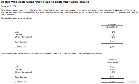 好市多周三发布月度报告,其9月份的净营收为214.6亿美元,同比增长10.1%;会员制仓储连锁店的同店营收增长了8.5%;美国的同店营收增长了11.2%;加拿大同店营收增长了5.7%;其他国际地区的同店营收下滑了1.9%。电子商务的可比营收上升0.7%。