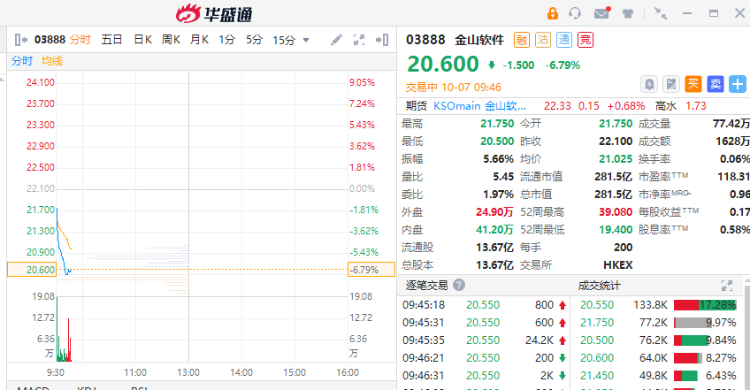 金山软件(03888)发盈警,股价随之低开1.58%,现跌6.79%,成交额1628万港元