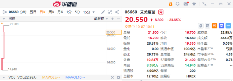 次新股艾美疫苗股价大涨超23% IPO募资1.57亿港元