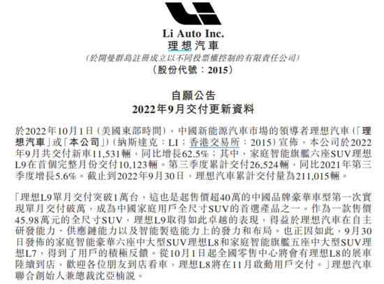 2)理想汽车第三季度交付量低于最初指引。瑞信曾表示,理想汽车第三季度的交付量高于其2.55万辆左右的最新指引,但低于其最初的2.7-2.9万辆指引,同比增长6%至26524辆。