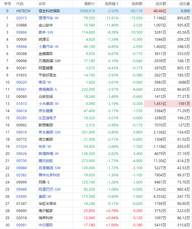 造车新势力集体重挫,理想汽车跌近16%,蔚来-SW大跌逾8%;科网股再度走弱,金山软件大跌11.40%,商汤-W、携程集团-S跌超3%,阿里巴巴、腾讯跌超1%。