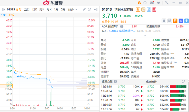 10月7日讯,华润水泥控股午后跌幅扩大至9.51%,报价3.71港元。