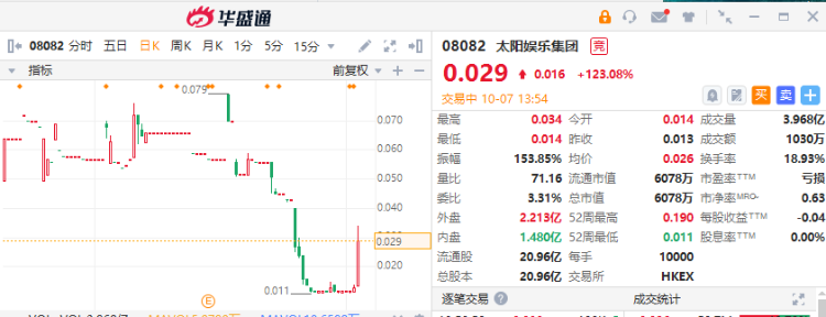 10月7日消息,太阳娱乐集团暴涨130.77%,现报0.03港元,市值6288万港元,原控股股东几近清仓退出。
